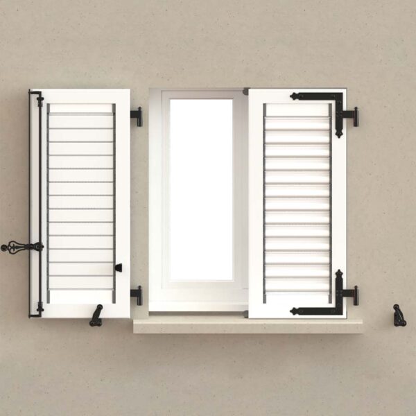 Quincaillerie : Sans entretien. Coloris noir. Pentures, espagnolette et poignée en aluminium, arrêts de vent et butées en composite, gonds pour scellement chimique avec tamis