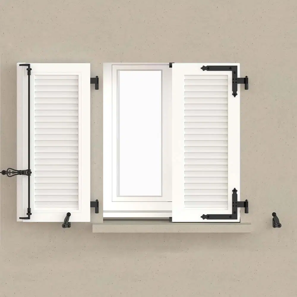Quincaillerie : Sans entretien. Coloris noir. Pentures, espagnolette et poignée en aluminium, arrêts de vent et butées en composite, gonds pour scellement chimique avec tamis